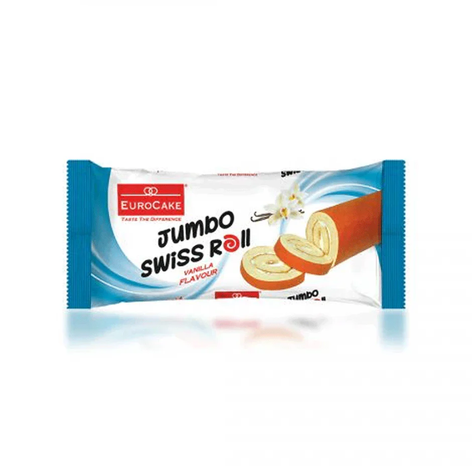 Euro Cake Jumbo Swiss Roll Vanilla Flavour 50g is a type of jumbo-sized Swiss roll cake that’s soft and moist in texture and features a delicious vanilla flavor, providing a tasty and convenient snack option.