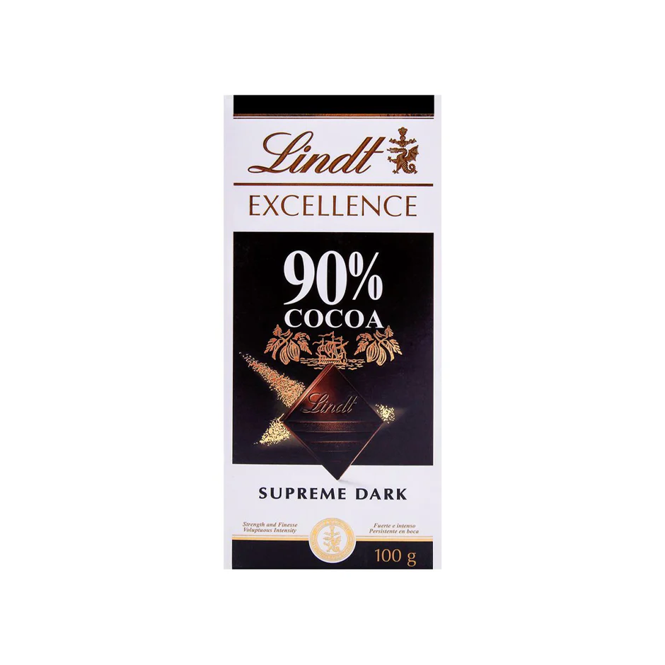 Lindt Excellence 90% Cocoa Supreme Dark 100g is a rich and intense dark chocolate experience featuring high-quality cocoa beans and a smooth, velvety texture, perfect for those who appreciate the finest and most refined dark chocolate.