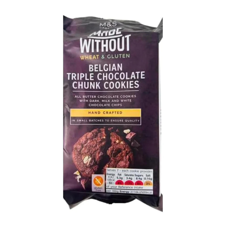 Marks & Spencer Belgian Triple Chocolate Chunks Cookies Wheat & Gluten 170g is a type of deliciously rich and indulgent cookie that features triple chocolate chunks and is made with wheat and gluten. The cookies are designed to provide a decadent and satisfying experience, with a perfect balance of flavors and textures.