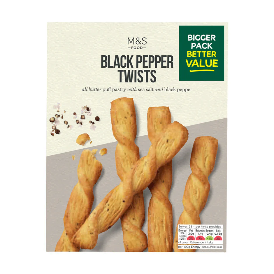 M&S Black Pepper Twists 125g is a type of savory and flavorful snack that features crunchy biscuit sticks infused with the distinctive taste of black pepper. The snack is designed to provide a delicious and satisfying experience, with a perfect balance of flavors and textures.