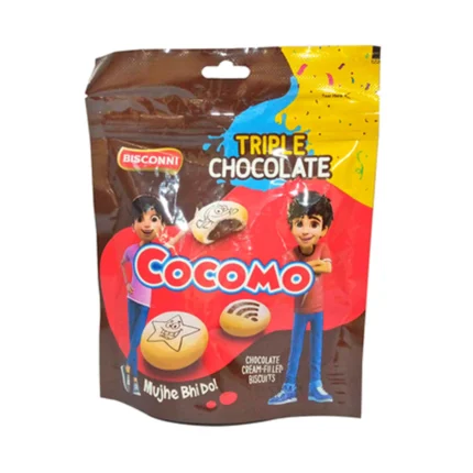 Bisconni Cocomo Triple Chocolate Cream-filled Biscuits are a type of sweet biscuit that features a rich and intense triple chocolate flavor, filled with a creamy chocolate filling, and packaged in a 79.2g pack size. These biscuits are designed to provide a decadent and indulgent treat for chocolate lovers, with a soft and crunchy texture that complements the creamy filling.